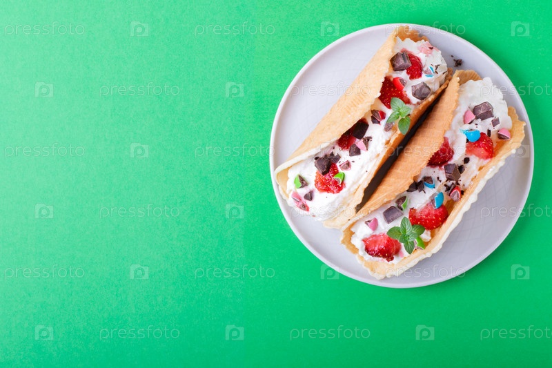 Сладкие тако с вафлями, творожным кремом и клубникой на белой керамической тарелке на зеленом фоне. Десертная вариация мексиканской классики. Копировать пространство