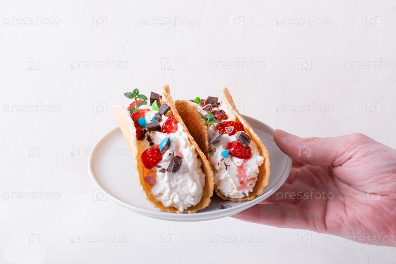 Сладкие тако с тонкими вафлями, творожным кремом и клубникой с шоколадом и мятой на белой керамической тарелке в мужской руке