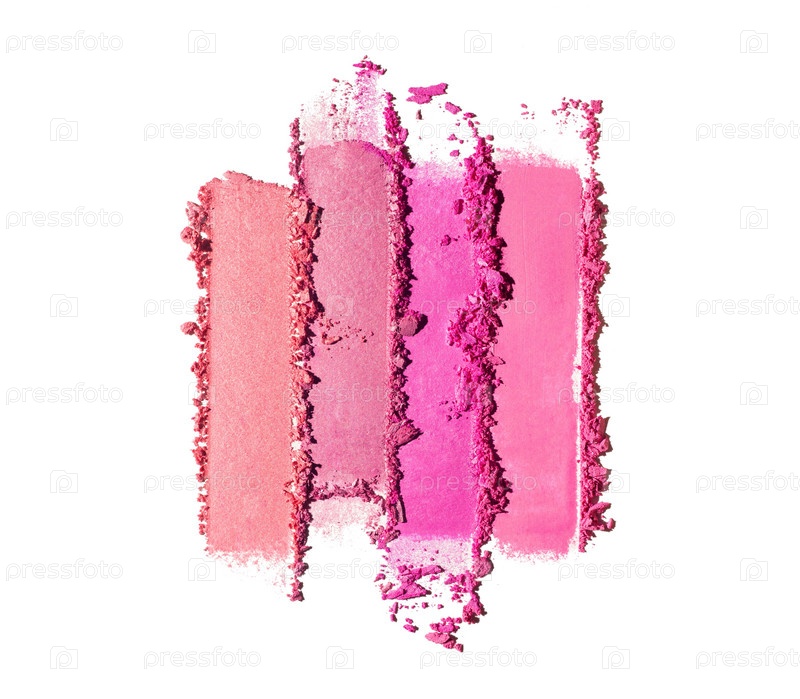 Косметические кораллово-розовые румяна размазали образец теней для век на белом фоне