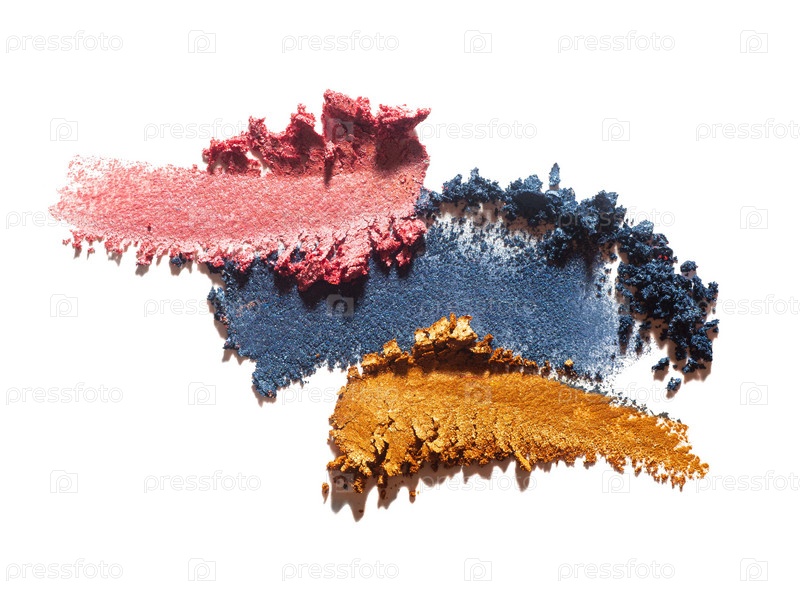 Косметические розовые голубые золотые размазанные тени для век на белом фоне