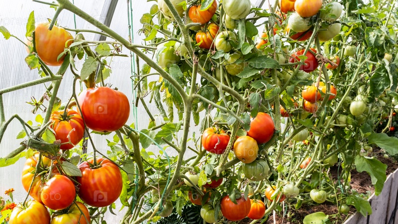 Спелые красные и незрелые зеленые помидоры в теплице