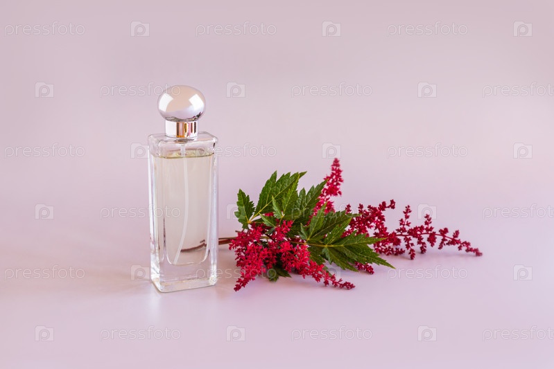 Прозрачный флакон женских духов или парфюмированной воды на пастельном фоне и розовая астильба. презентация аромата. Пустой макет