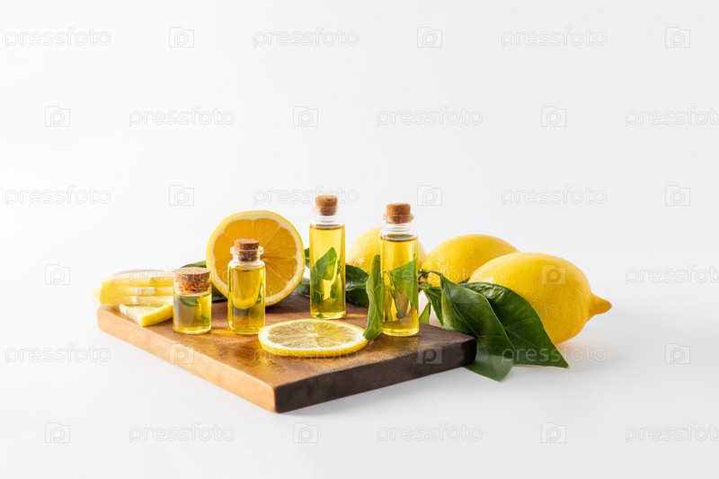 Несколько бутылок с крышкой с натуральным лимонным средством стоят на деревянной доске среди ломтиков и плодов лимона. органическая забота о себе. ароматерапия