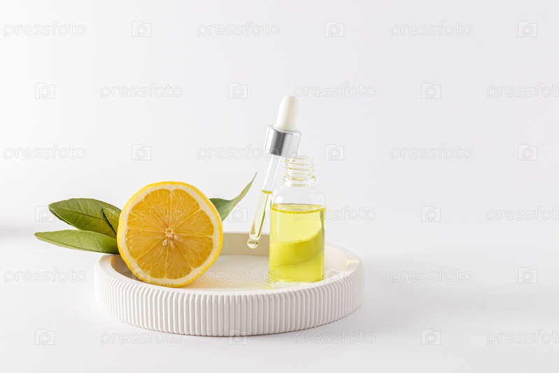 Натуральное органическое средство по уходу за кожей лица на основе эфирного масла лимона в прозрачном флаконе и пипетке. белый фон. передний план
