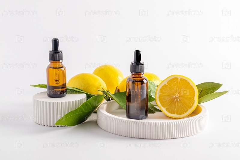 Две косметические бутылки из янтарного стекла с капельницей с лимонной сывороткой или маслом для ухода за кожей лица стоят на белом подиуме среди спелых лимонов