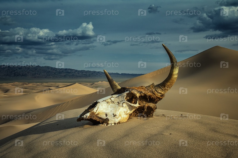 Череп быка в песчаной пустыне и грозовых облаках
