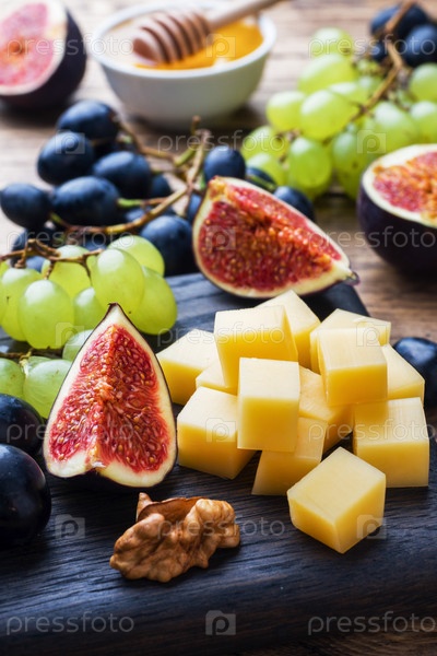 Кубики сыра, свежие фрукты, инжир, виноград, медовый орех на деревянной разделочной доске. Выборочный фокус. Закрыть