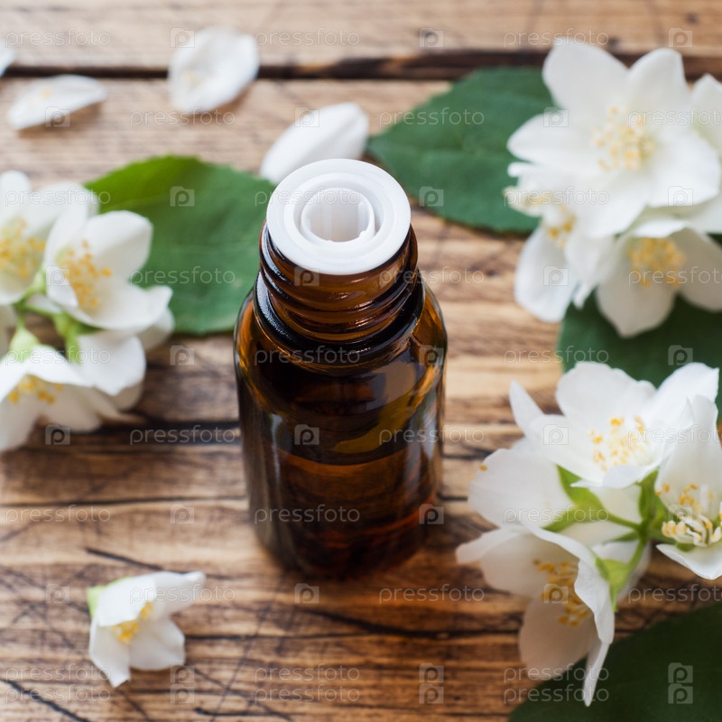 Масло жасмина. Ароматерапия с маслом жасмина. Цветы жасмина. Деревянный фон с копией пространства
