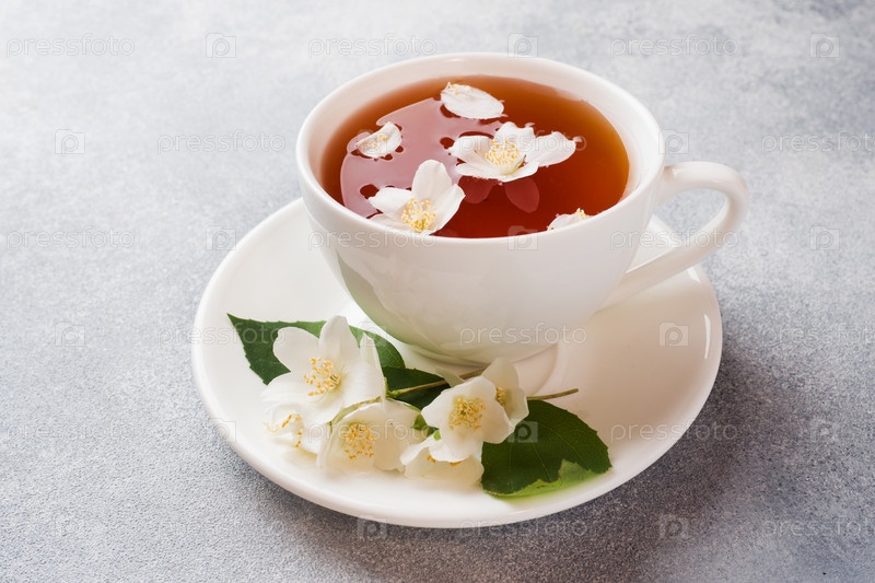 Чашка чая с цветами жасмина на сером столе с копией пространства