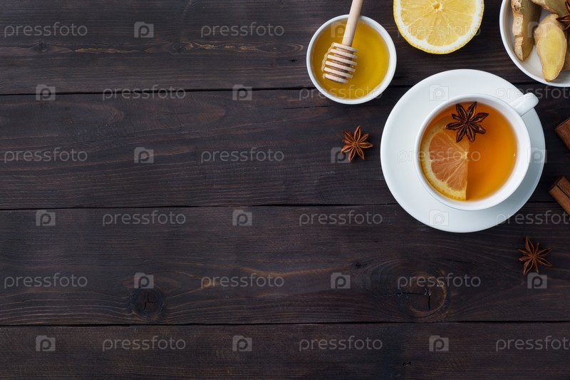 Белая чашка с натуральным травяным чаем, имбирем, лимоном и медом с корицей. Энергетический витаминный напиток используется при простуде. Темное деревянное пространство для копирования фона
