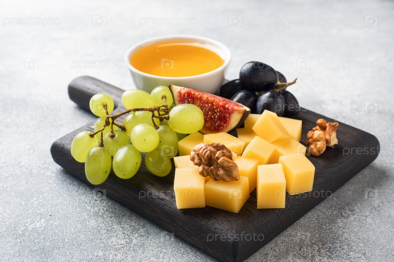 Кубики сыра, свежие фрукты, инжир, виноград, медовый орех на деревянной разделочной доске. Скопируйте пространство