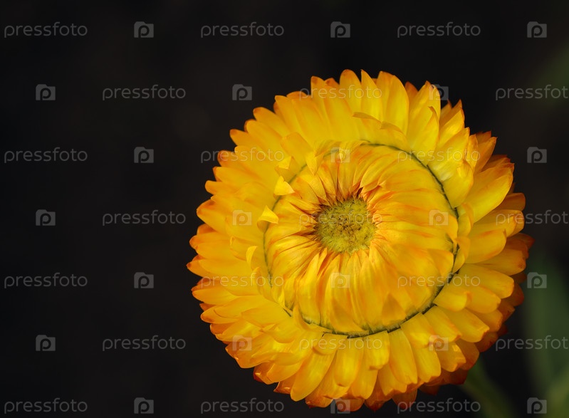 Ярко-оранжевый цветок бессмертного (Helichrysum) на темном фоне при естественном освещении