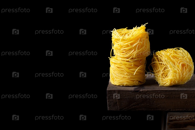 Яичная паста гнездится на деревянном столе на черном фоне. Копировать пространство
