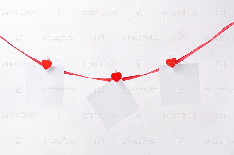 Пустые квадратные наклейки висят на красной веревке с сердечными зажимами. Шаблон с копией пространства. День Святого Валентина фон