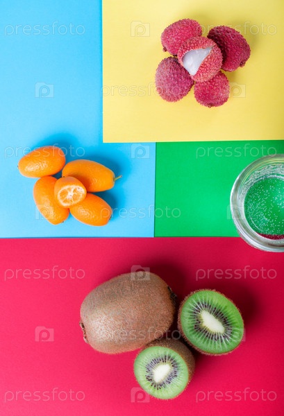 Личи, киви, кумкват и стакан воды на геометрическом разноцветном фоне. Ассорти из тропических фруктов. Модная плоская планировка