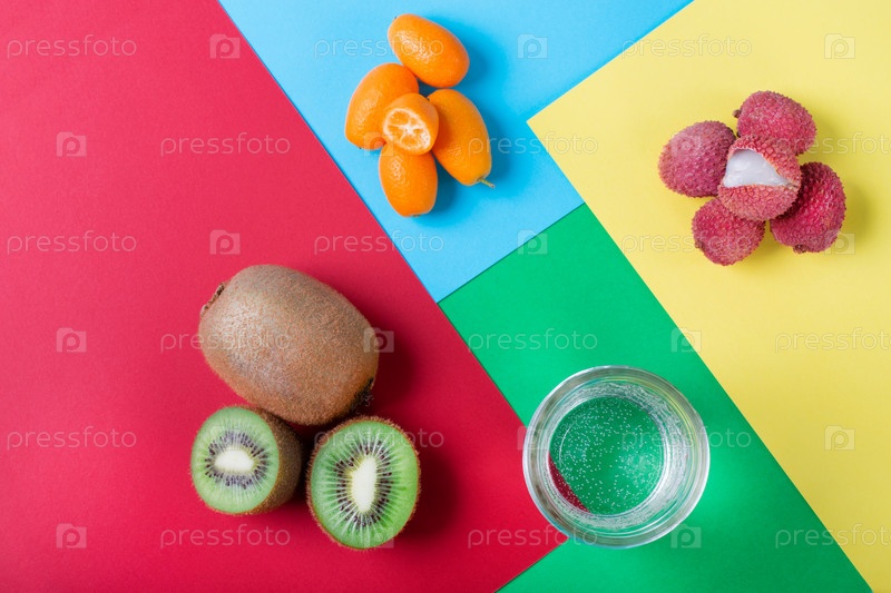 Личи, киви, кумкват и стакан воды на геометрическом разноцветном фоне. Ассорти из тропических фруктов. Модная плоская планировка
