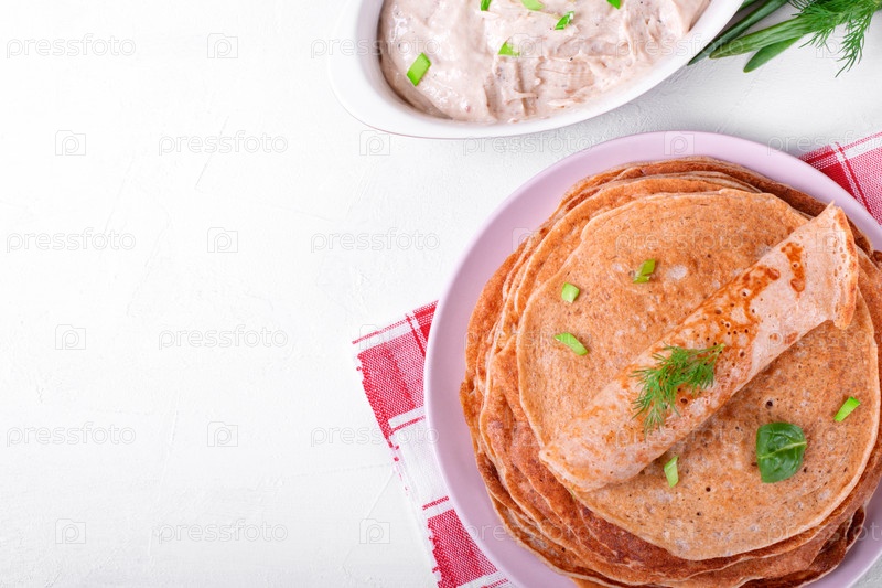 Блинчики с ржаной мукой и селедочным маслом подаются на белом столе. Традиционная русская еда на Масленицу