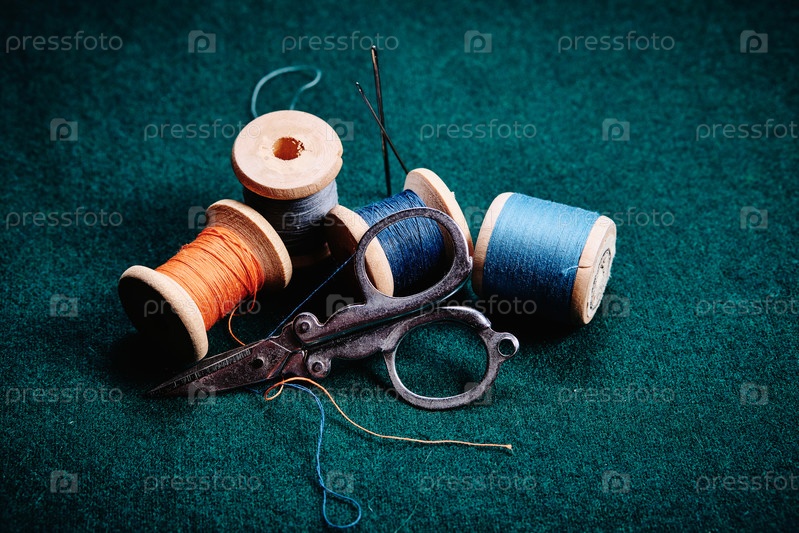 Старые деревянные катушки с разноцветными нитками и ножницами на зеленой ткани. Ретро натюрморт. Крупный план. Выборочный фокус