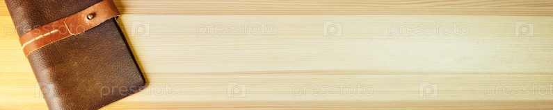 Баннер из коричневой кожаной тетради с ремешком на деревянном столе. Теплая подсветка. Место для надписей и дизайна