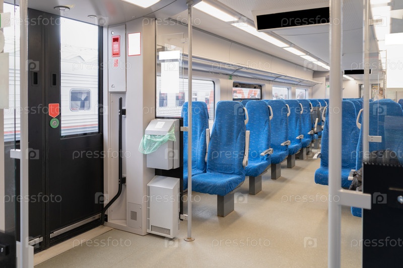 Внутри вагонного поезда. Интерьер пассажирского поезда с пустыми синими тканевыми сиденьями