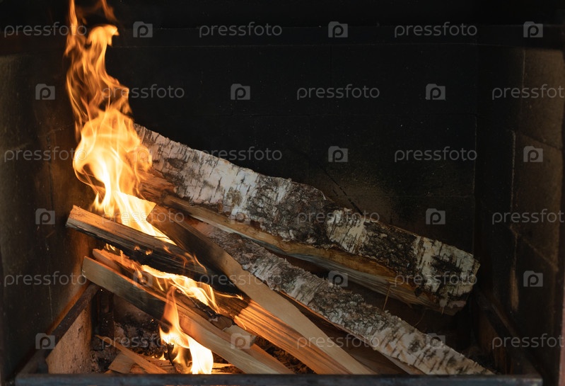Горящий камин. В камине горят березовые поленья. Тепло в холодную погоду