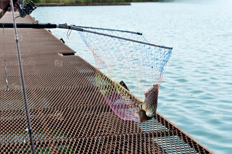 Рыбак ловит рыбу на форелевой ферме спиннингом и вылавливает ее сетью. Рыбалка — азартное хобби