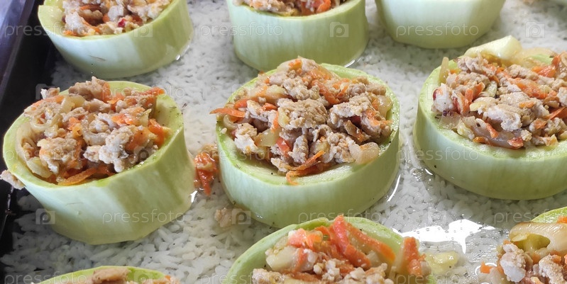 Фаршированные мясом кабачки крупным планом, на подушке из риса