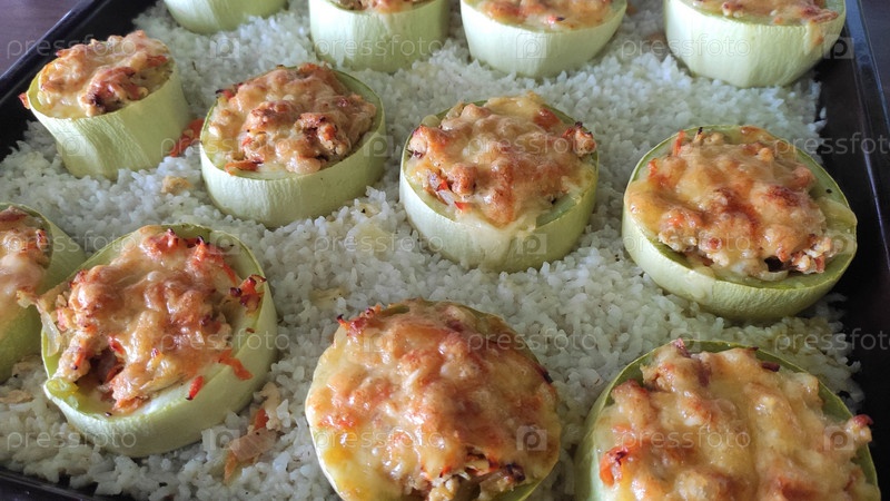 Фаршированные кабачки, запеченные с рисом на противне в духовке.повседневная еда