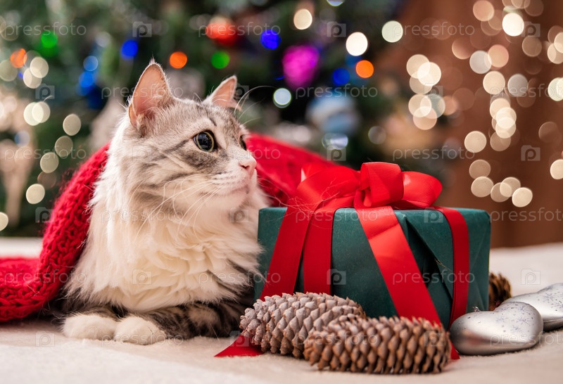 Рождественский кот. Портрет толстого пушистого кота рядом с подарочной коробкой на фоне елки и огней гирлянд