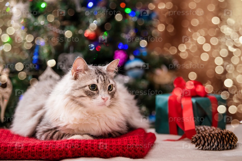 Рождественский кот. Портрет толстого пушистого кота рядом с подарочной коробкой на фоне елки и огней гирлянд