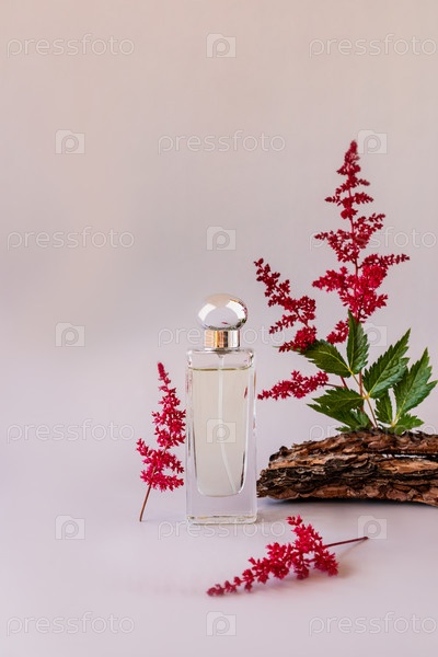 Вид спереди на элегантную бутылку женских духов с веточками розовой астильбы и корой дерева. трендовая концепция натуральных материалов. реклама