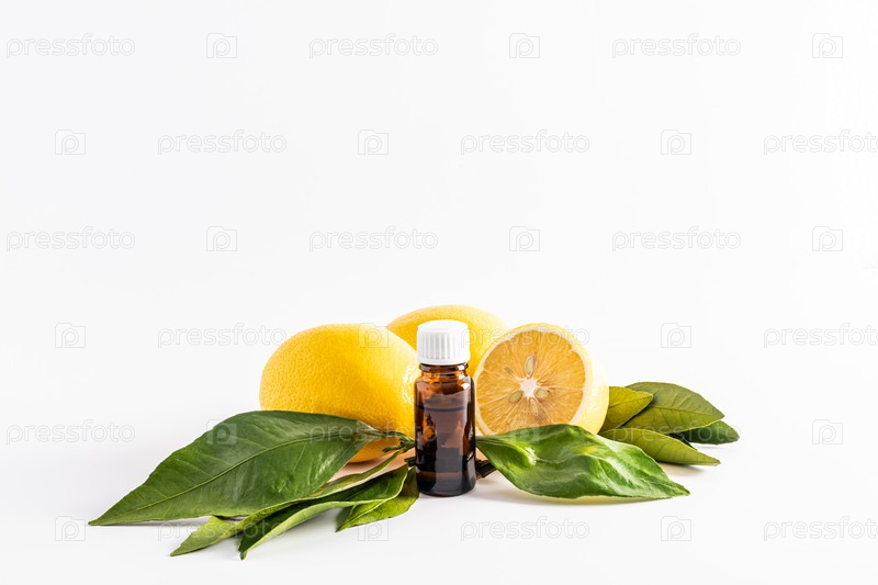 Медицинская бутылка из темного стекла с белой пробкой на фоне спелых лимонов и листьев. эфирное масло лимона. витамин С. Спа, ароматерапия