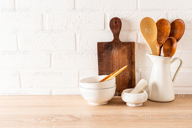 Кухонный фон для планировки с копией пространства на стене из белого кирпича. минималистская композиция части кухонной столешницы
