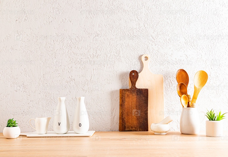 Современный кухонный фон с посудой на деревянной столешнице у текстурированной стены. место для текста. ЭКО предметы