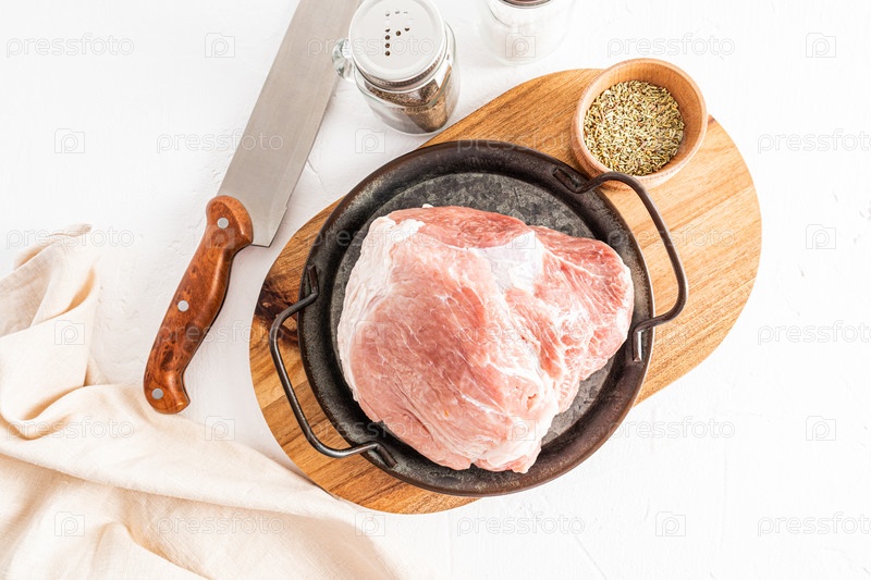 Сочная вырезка фермерской свинины для приготовления вкусного обеда. вид сверху на мясо и ингредиенты для приготовления пищи. белый фон