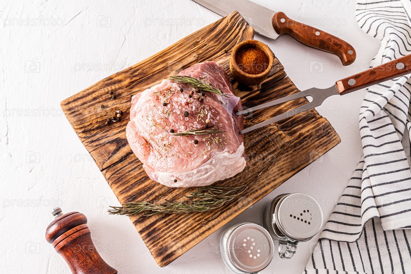 Большой кусок свиной ветчины лежит на текстурированной деревянной разделочной доске с ингредиентами для приготовления пищи. нож, вилка для мяса, специи
