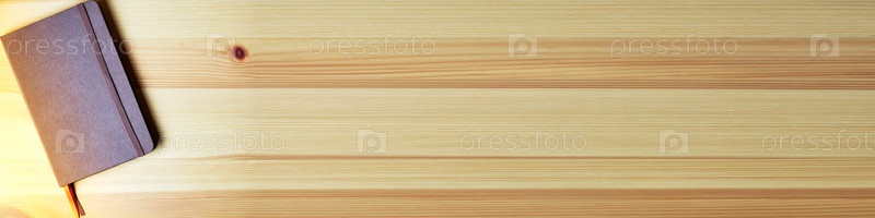 Баннер из коричневой тетради с резинкой и разноцветными закладками на деревянном столе. Теплая подсветка. Место для надписей и дизайна
