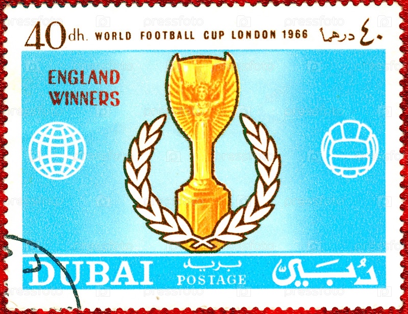 ОАЭ, Дубай - около 1966: Почтовая марка с изображением футбольного кубка и надписью "Чемпионат мира по футболу в Лондоне 1966" из серии "Футбол"