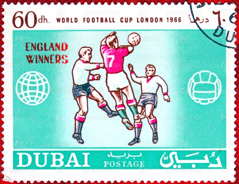 ОАЭ, Дубай - около 1966 года: Почтовая марка с изображением футболистов, с надписью "Чемпионат мира, Лондон, 1966" из серии "Футбол"