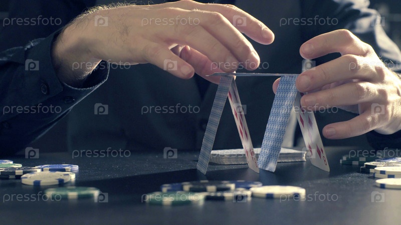 Мужские руки строят домик из игральных карт