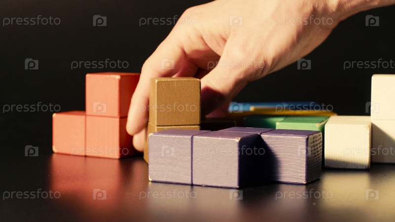 Мужская рука собирает цветные кубики. 3D тетрис