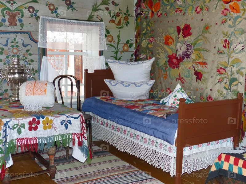 Чистая (белая) часть крестьянского дома. Уральская роспись – уникальный народный промысел. Музей-заповедник деревянного зодчества и народного творчества. Нижняя Синячиха, Россия