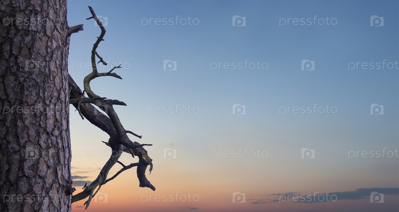 Сосна и сушеная ветка на фоне закатного неба. Латвия, Рига