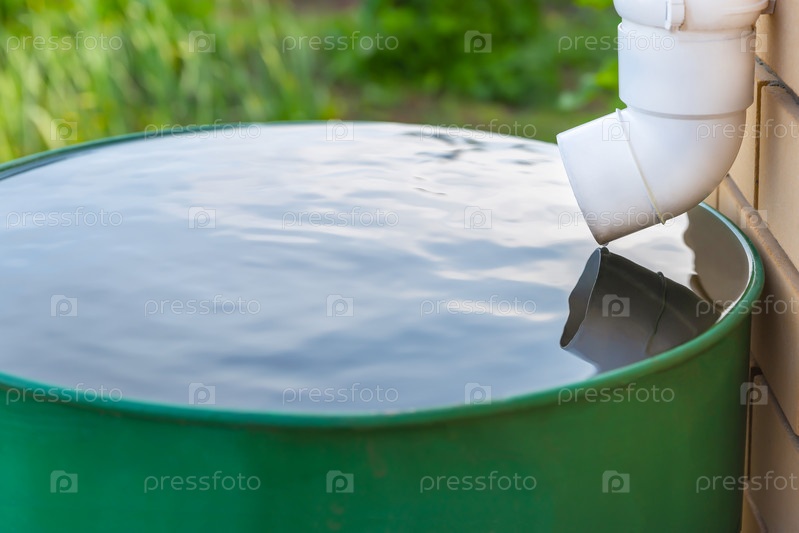 Водосточная белая труба и зеленая железная бочка, наполненная водой. Мягкий фокус. Закрыть. Концепция устройства стока, сбор дождевой воды