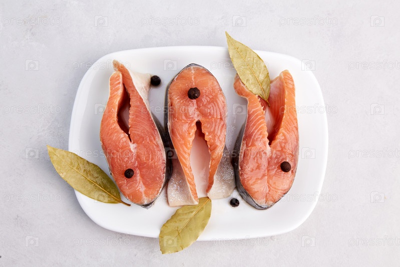 Свежие стейки из лосося на белой тарелке