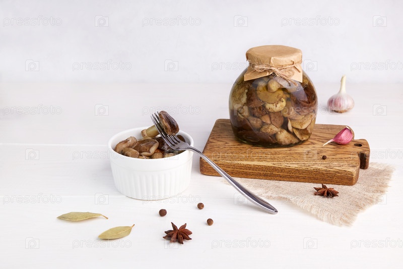 Маринованные грибы в стеклянной банке и миске. Домашняя консервация продуктов