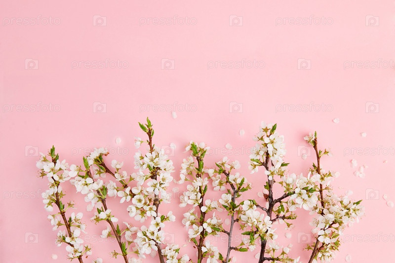 Цветущие ветки сливы на розовом фоне. Макет открытки, цветочный дизайн. Плоская планировка