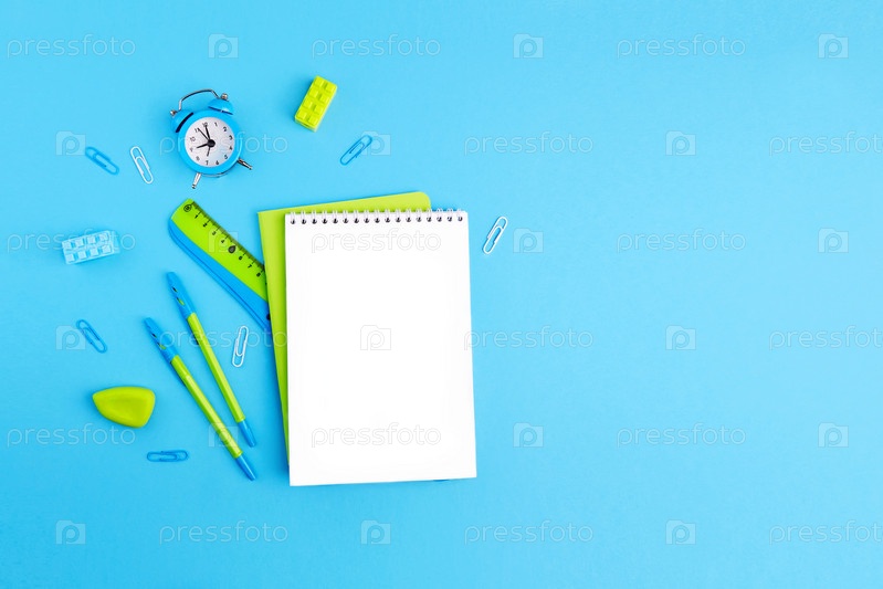 Школьные принадлежности. Пустой блокнот, ручки, линейка, будильник, скрепки, резинка. Зеленый и синий цвета
