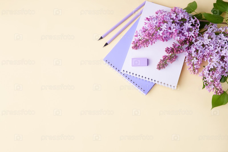 Блокнот, карандаши и ветки сирени на желтом фоне. Концепция домашнего комфортного обучения