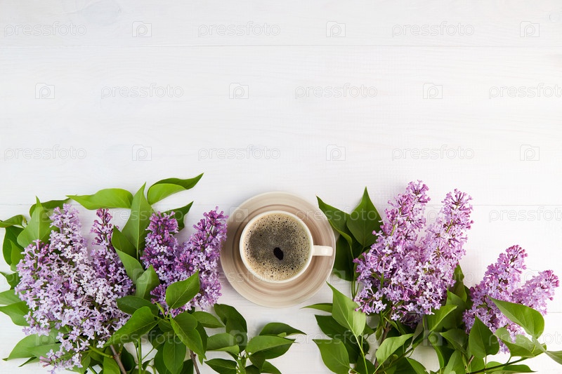Весенний фон. Ветки сирени и чашка кофе на белом деревянном фоне